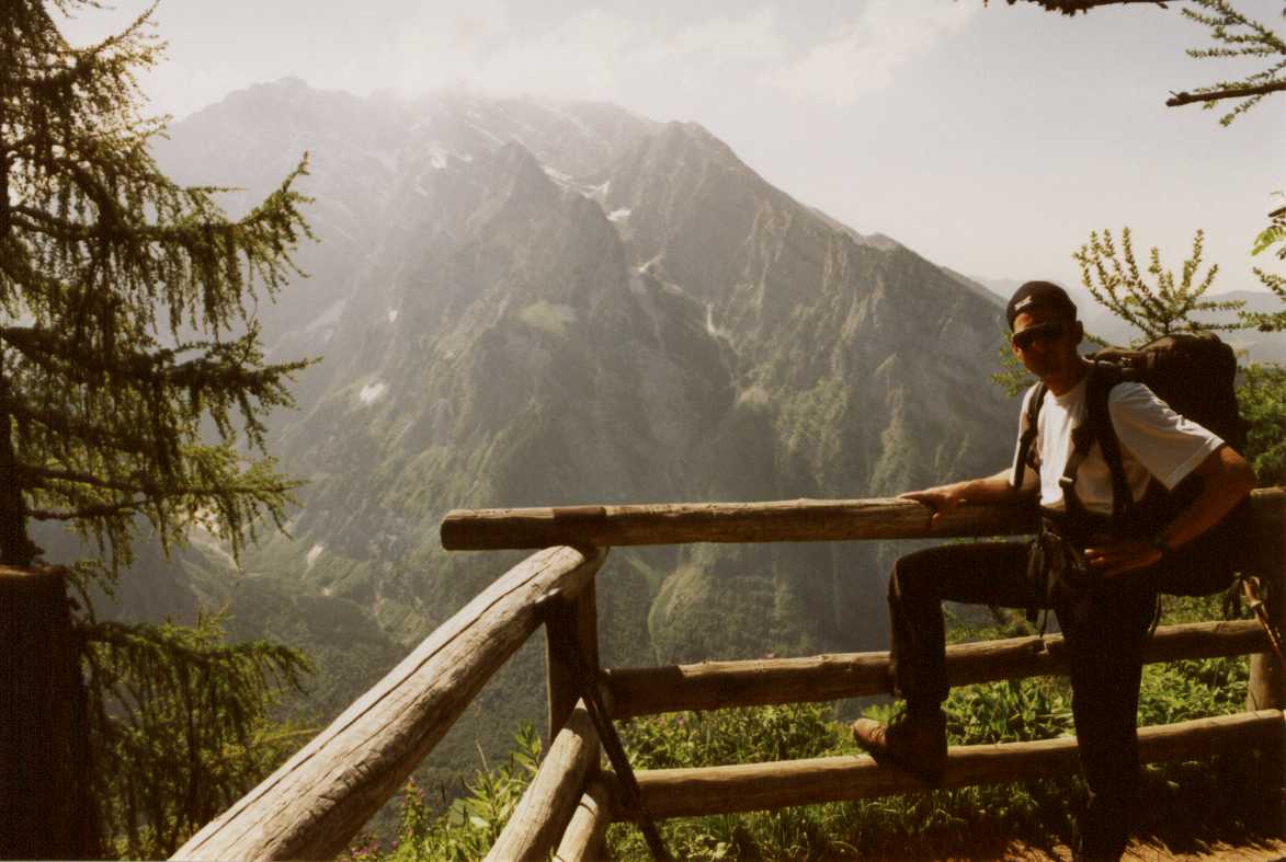 Vor dem Start haben wir lange diskutiert, ob wir dieses Jahr aufgrund der stabilen warmen Wetterlage auf die Mitnahme unseres legendären “Grossraumzeltes” verzichten sollten. Wir gingen das Risiko ein, indem wir die 5 kg Gepäck im Auto beliessen.. Wir machten uns mit unseren, wie üblich immer noch viel zu schweren Rucksäcken auf den Weg hoch zur Königsbach Alm (Gehzeit 1.30 h). Der breite Weg verläuft fast stetig im Wald. In der Mitte kommt erstmals ein Aussichtspunkt, von wo aus ein toller Blick hinunter zum Königsee möglich ist.