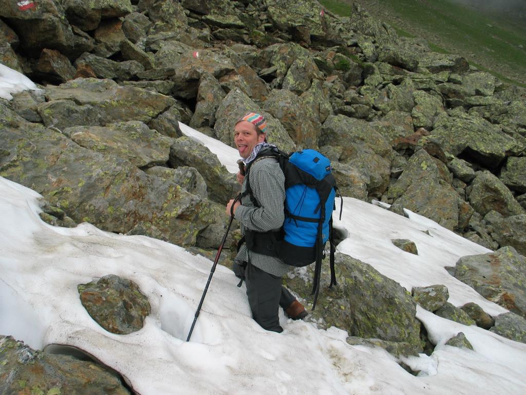 Tatsächlich war der Sonntagmorgen einer von der bedeckt-trüben Sorte, weshalb wir uns in unserem Lagerplatz nochmals zur anderen (Schlaf-)Seite wandten. Nach dem Frühstück (welches Frühstück würde Rollistone einwerfen) entschlossen wir uns trotz der Situation zu einem Aufstiegsversuch zum Großen Trögler. Nur kurz wurden uns Einblicke in die umliegende grandiose Berglandschaft gewährt, zumeist war alles wolkenverhangen, und wir gingen wie in einem Suppentopf spazieren (zum Glück nicht als (w)arme-Würstchen-Suppenbeilage!). Auf ca. 2600 Metern erreichten wir den Beginn eines mit Seil und Eisentrittstufen versehenen Steilstückes. Wir erklärten diesen Ort zum persönlichen Gipfel unseres Aufstieges und kehrten um.