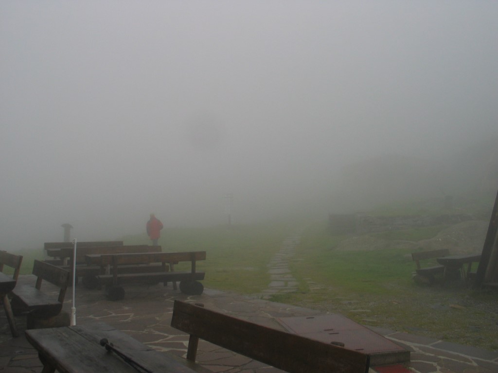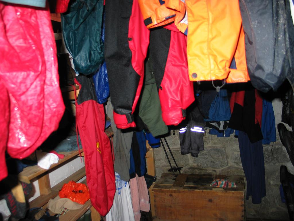 Besonders die letzten Minuten auf dem Weg zur Hütte fing es stärker an zu regnen und wir waren froh, die Hütte erreicht zu haben. Bei unserer Ankunft hängten wir die nassen Sachen in den sog. Trockenraum. Mit dem Eintreffen weiterer nasser Wanderer wurde dieser Raum so nach und nach eine Tropfsteinhöhle und schließlich ein Feuchtereservat für Bergkröten (was zwangsläufig zur Frage führt, mit welcher Währung denn diese Tiere zahlen…und ob sie überhaupt rechnen können ??).