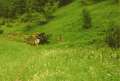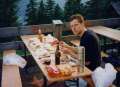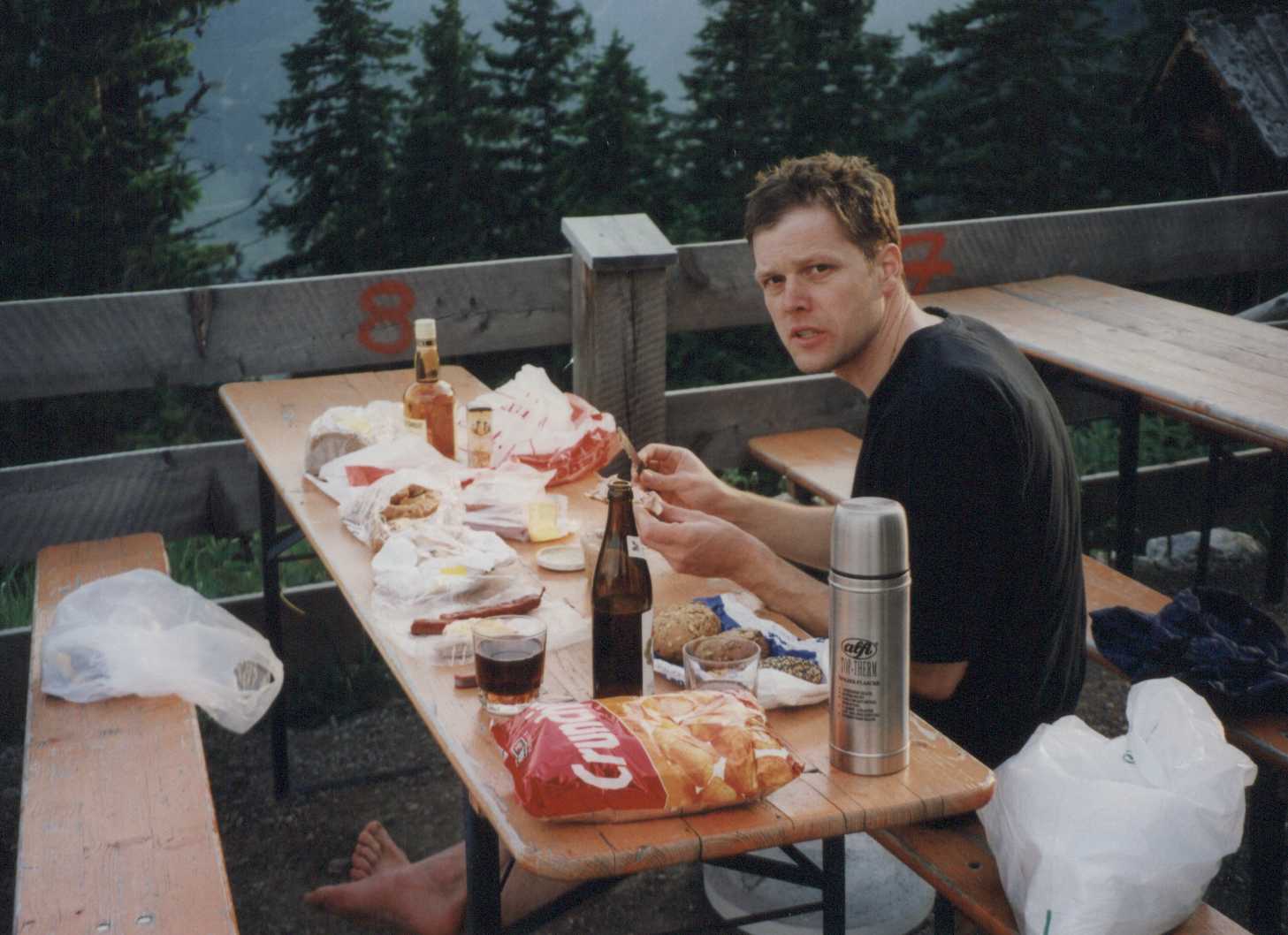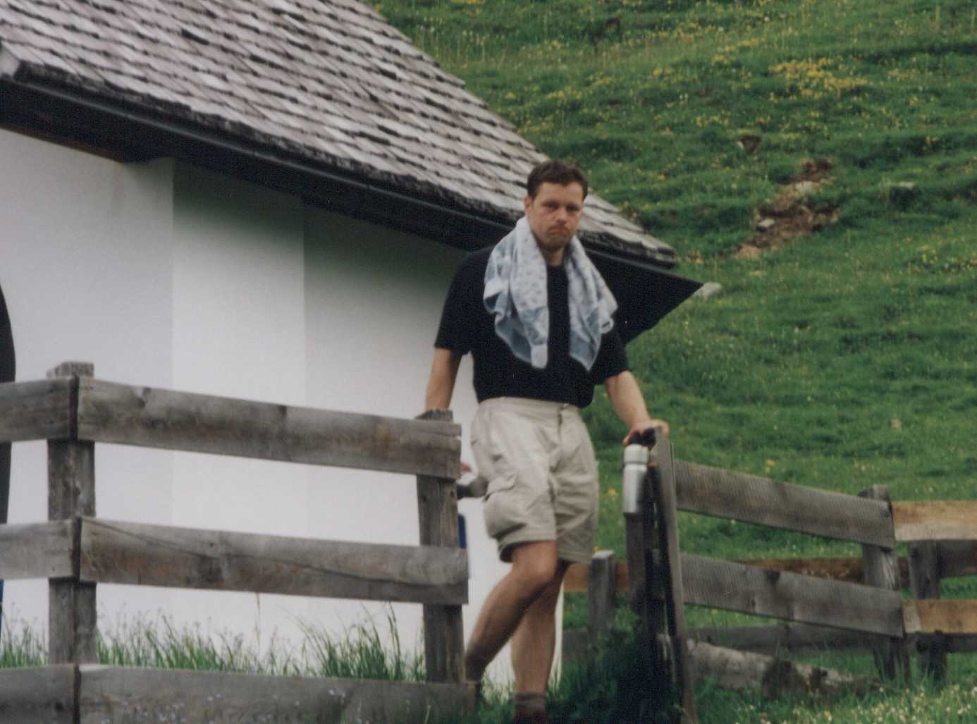 Wir gingen die Fahrstrasse hinauf zur Tuftlalm. Auf dem Weg dorthin passierten wir die Stelle, , wo Helmiman den Jahreswechsel 1999/2000 im Zelt in einer Waldlichtung verbracht hatte. Nach 1.30 h waren wir an der Alm angekommen. Das Wetter war im Begriff, in eine Gewitterstimmung umzukippen. Ganz eindeutig war es nicht, wann es passieren würde. Wir fragten die Hüttenleute und beratschlagten, ob wir es wagen sollten, noch hoch auf den Daniel zu steigen. Schließlich entschieden wir uns doch dazu. Wir ließen die großen Rucksäcke an der Alm zurück und gingen nur mit einem kleinen, mit nur einem asymmetrischen Träger modisch gestylten, aber völlig unpraktischen Tagesrucksack (sponsored by Rollistone !) hoch zum Daniel. Es war schwül-warm. und das Wetter stand beständig auf der Kippe. Wir hatten ungefähr 2/3 des Aufstiegs geschafft, da fing es an zu regnen. Es sah allerdings nur nach einem kurzen Schauer aus, sodas wir weiter Richtung Gipfel stürmten. Den erreichten wir dann auch nach 1.20 h Aufstiegszeit.